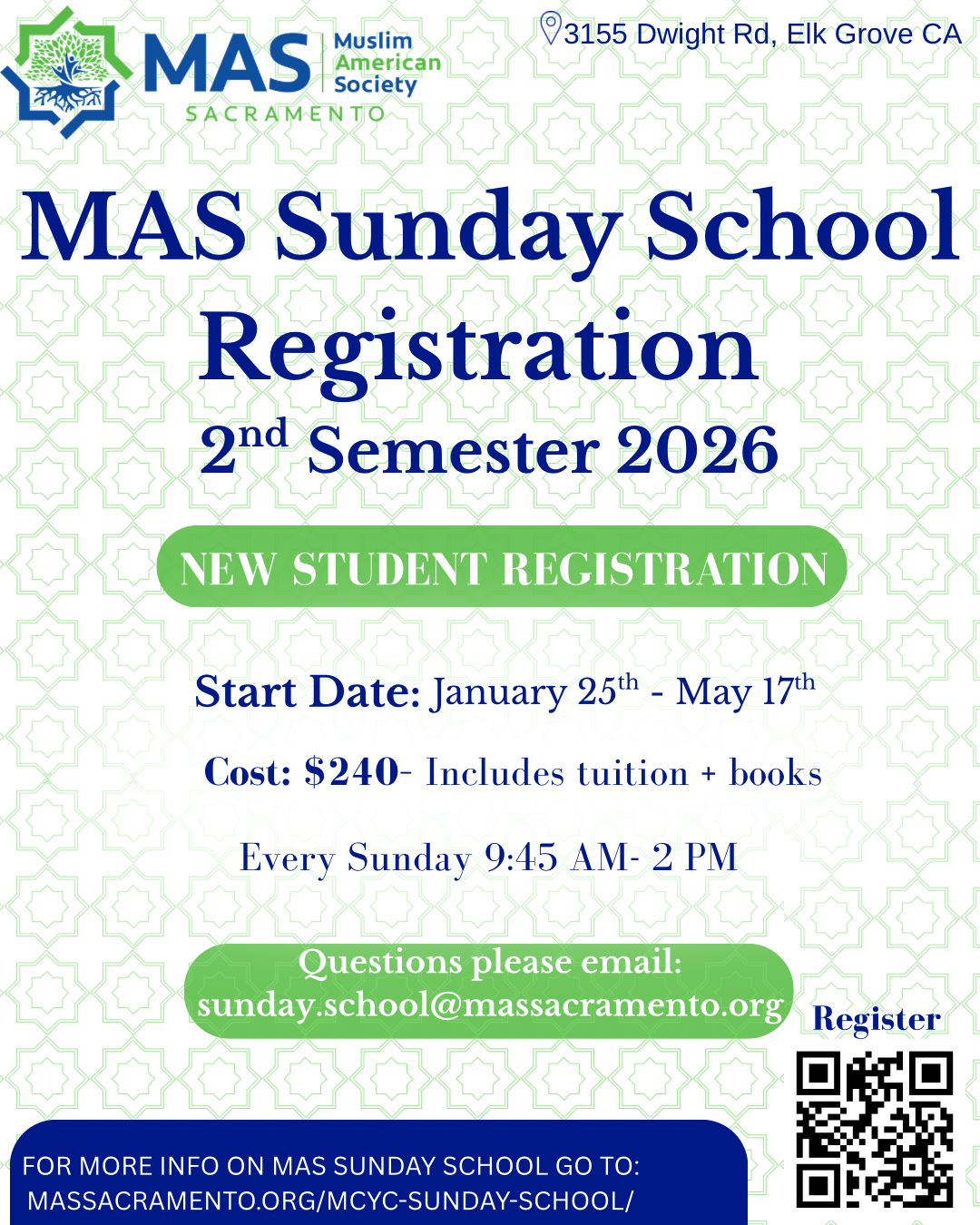 Tuition is applicable for one semester of the academic year and is due in full upon registration in August and January. MAS Sunday School financial assistance is limited and is on a first come first serve basis till the funds are exhausted. Student(s) must meet the conditions of financial hardship to apply for assistance. If tuition is not paid on time, there will be a late fee and student(s) may be dropped.