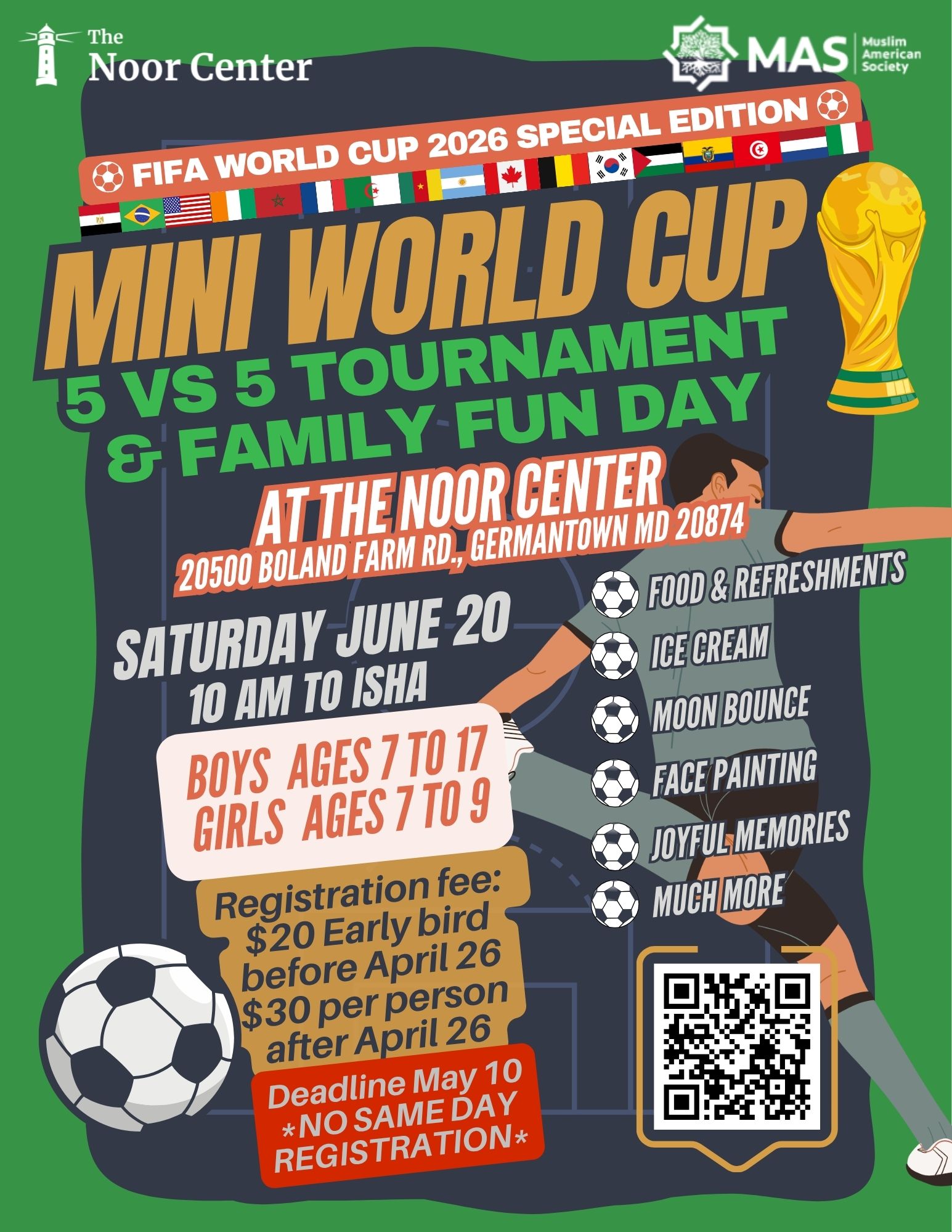 By registering for this program, I confirm that I am the parent or legal guardian of the child listed above. I understand that participation in sports and recreational activities involves inherent risk. I voluntarily allow my child to participate in the Noor Center Mini World Cup 2026 and agree to the event waiver and release of liability.