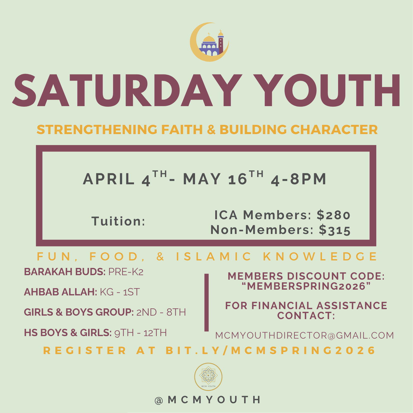By registering, I acknowledge that I will not seek to have the Islamic Cultural Association (Michigan Community Mosque) held liable in the event that any accident, injury, loss of property or any other circumstance or incident occurs during or as a result of my son’s/daughter’s participation in the program. This release of liability includes accident, injury, loss, or damages to the student, as well as, to other individuals or property which may result from the student’s participation in the event. I hereby release and agree to hold harmless ICA (MCM), its officials, agents and employees, from any claims arising out of my son’s/daughter’s participation in the event(s). In the event of an emergency, counselors will contact emergency parent/guardian contact number provided at registration followed by taking measures according to the situation. In a health emergency the nearest health facility will be utilized. This registration indicates that you have read and understand and accept all of the statements recited above and accept full responsibility as described. Jazakum Allahu Khairan. For any questions or concerns, please contact us at mcmyouthdirector@gmail.com or call 248-488-5600